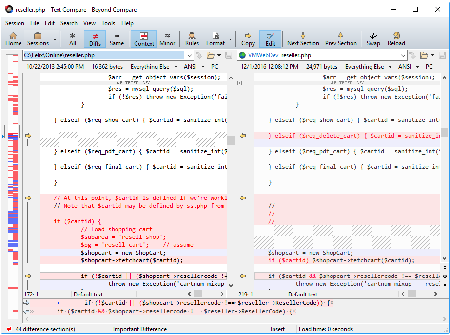 2つのソースコードファイルの比較です。特定の相違点は赤いテキストでマークされており、 相違点があることを示すために行全体が薄い赤の背景で示されています。 ショートカットキーを使用すると、コードを一方の側からもう一方の側にすばやくコピーできます。