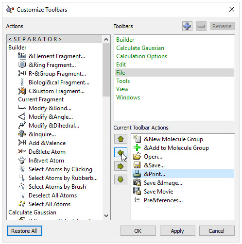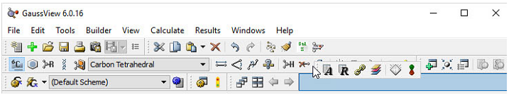 ここでは、ツールバーを大幅に変更しました。「View」グループと「Windows」グループの両方を完全にオフにしました。 また、Standardize Z Matrix、Copy、Cut、Paste、Delete、Select Atoms by Brush、Rubber Band、Clicking などのアイコンを個別に削除しています。 さらに、Deselect と Select all atoms を短くなった Edit グループに移動し、Rebond, Clean, Symmetrize を Builder グループに移動し、 利便性を向上させました。最後に、 Calculate Gaussian と Calculations Operationsのグループを画面下に移動し、 ビルディング操作と分離するように変更しました。