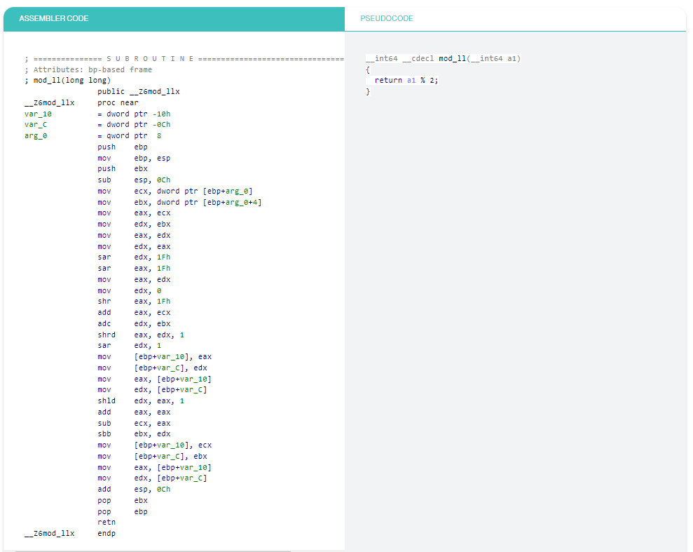 サイズの違いに注意してください! 逆アセンブル出力では、コンパイラが符号付き除算とモジュロ演算用にこのような複雑なコードを生成することを知っている必要があるだけでなく、パターンの認識にも時間を費やす必要があります。 言うまでもなく、逆コンパイラは物事を本当に簡単にします。