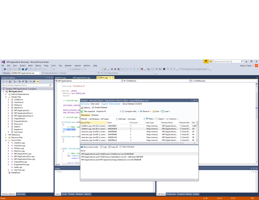 - Visual Studio 拡張:デバッグ開始と同時に Deleaker ウィンドウが現れ、リアルタイムに割当てを追跡。必要に応じて有効/無効を切替。