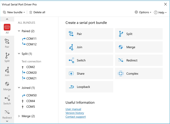 • Virtual Serial Port Driver:仮想 COM ペアの作成、PRO の分割/結合/マージ/スイッチャー/ループバック。