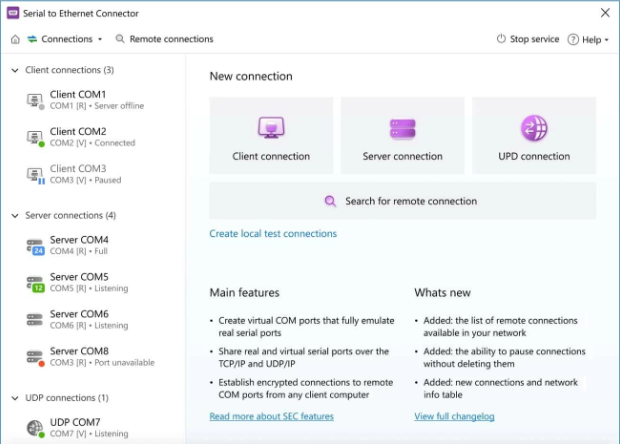 SEC は RS-232/422/485 のデータを IP 越しにリダイレクトし、クライアント側に仮想シリアルポートを作成して遠隔機器へブリッジします。同時クライアント接続(読み書き制御)、リンク断時のデータバッファリング、一対多配信のUDP ブロードキャスト、RFC 2217/Telnet によるポートパラメータ制御など、産業/OT 現場で有用な機能を備えます。
