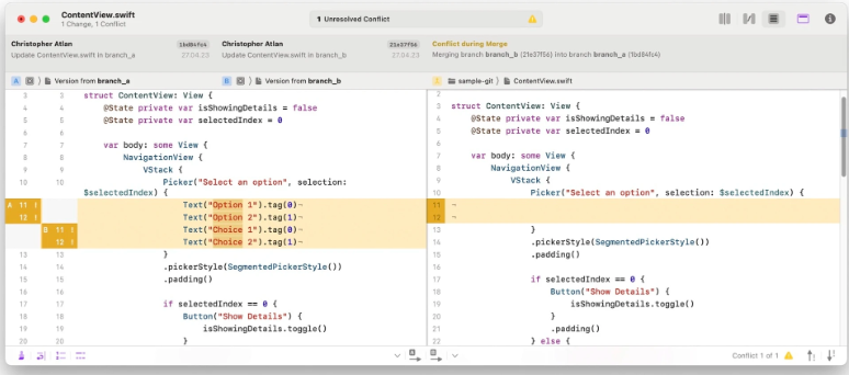 Kaleidoscopeでは、Gitからのマージコンフリクトを解決する際に関連するコンテキストが追加され、複雑なマージ作業を行う際の理解を容易にします。