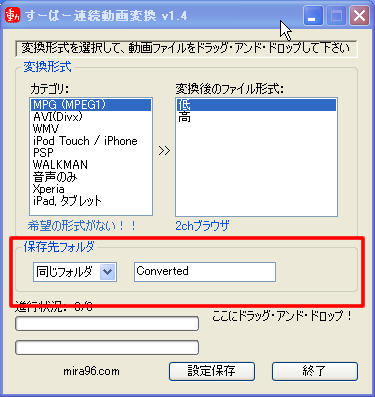 「すーぱー連続動画変換」は、変換形式を選択し複数の動画ファイルをドラッグ・アンド・ドロップするだけで超簡単に動画を変換できるソフトです。